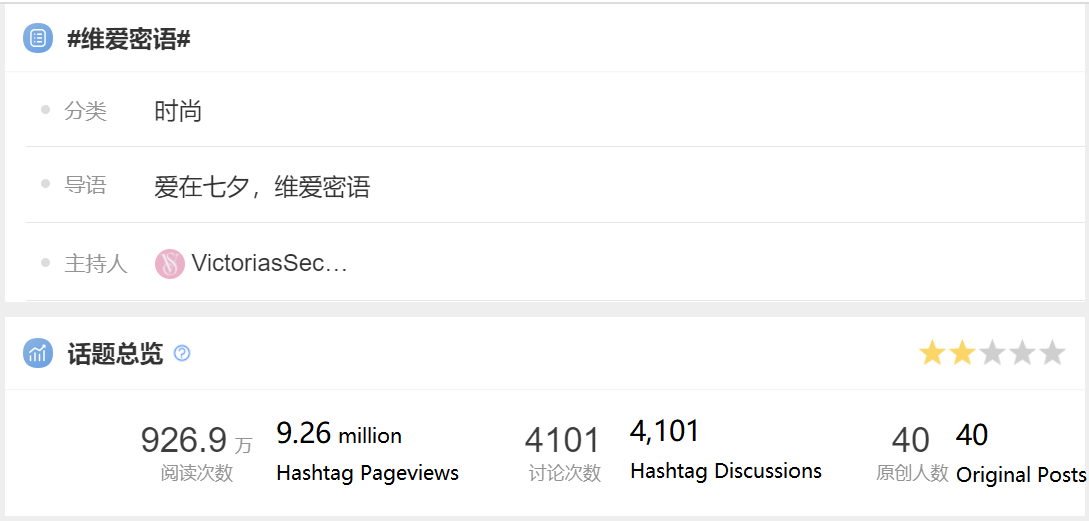 Posted relative social media content about the perfume with the hashtag #维爱密语 (Victoria's Secret Love) on Weibo, one of China's biggest social media platforms. Posts gained 9.26 million hashtag pageviews and more than 4,000 hashtag discussions